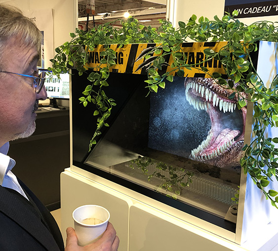 Elles intègrent un écran transparent ou semi-transparent qui projette un hologramme en 3D tout en laissant apparaître l’objet physique à l’intérieur. Une solution premium pour magnifier un produit et raconter une histoire autour de lui.
